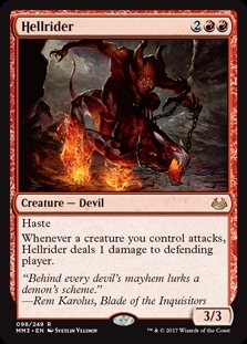 Whenever a creature you control attacks, Hellrider deals 1 damage to defending player.