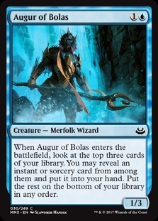 When Augur of Bolas enters the battlefield, look at the top three cards of your library. You may reveal an instant or sorcery card from among them and put it into your hand. Put the rest on the bottom of your library in any order.