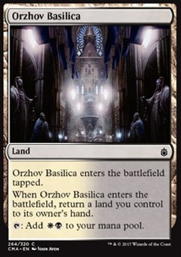 When Orzhov Basilica enters the battlefield, return a land you control to its owner's hand.