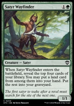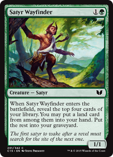 When Satyr Wayfinder enters the battlefield, reveal the top four cards of your library. You may put a land card from among them into your hand. Put the rest into your graveyard.