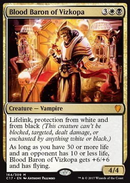 As long as you have 30 or more life and an opponent has 10 or less life, Blood Baron of Vizkopa gets +6/+6 and has flying.