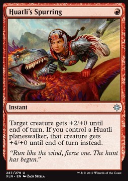 Target creature gets +2/+0 until end of turn. If you control a Huatli planeswalker, that creature gets +4/+0 until end of turn instead.